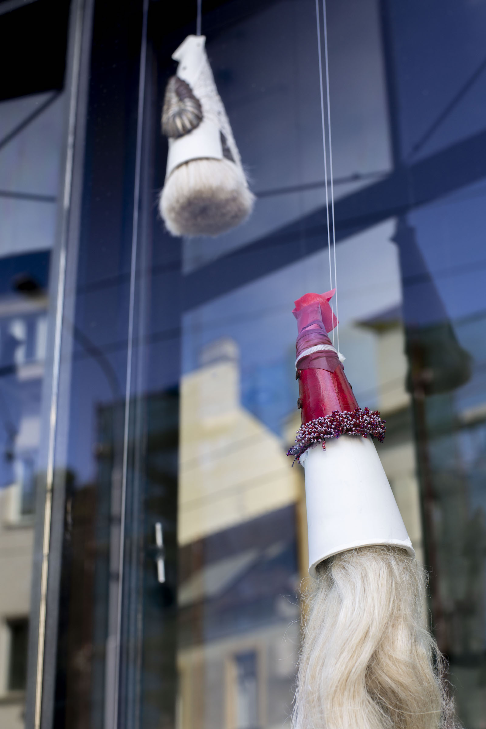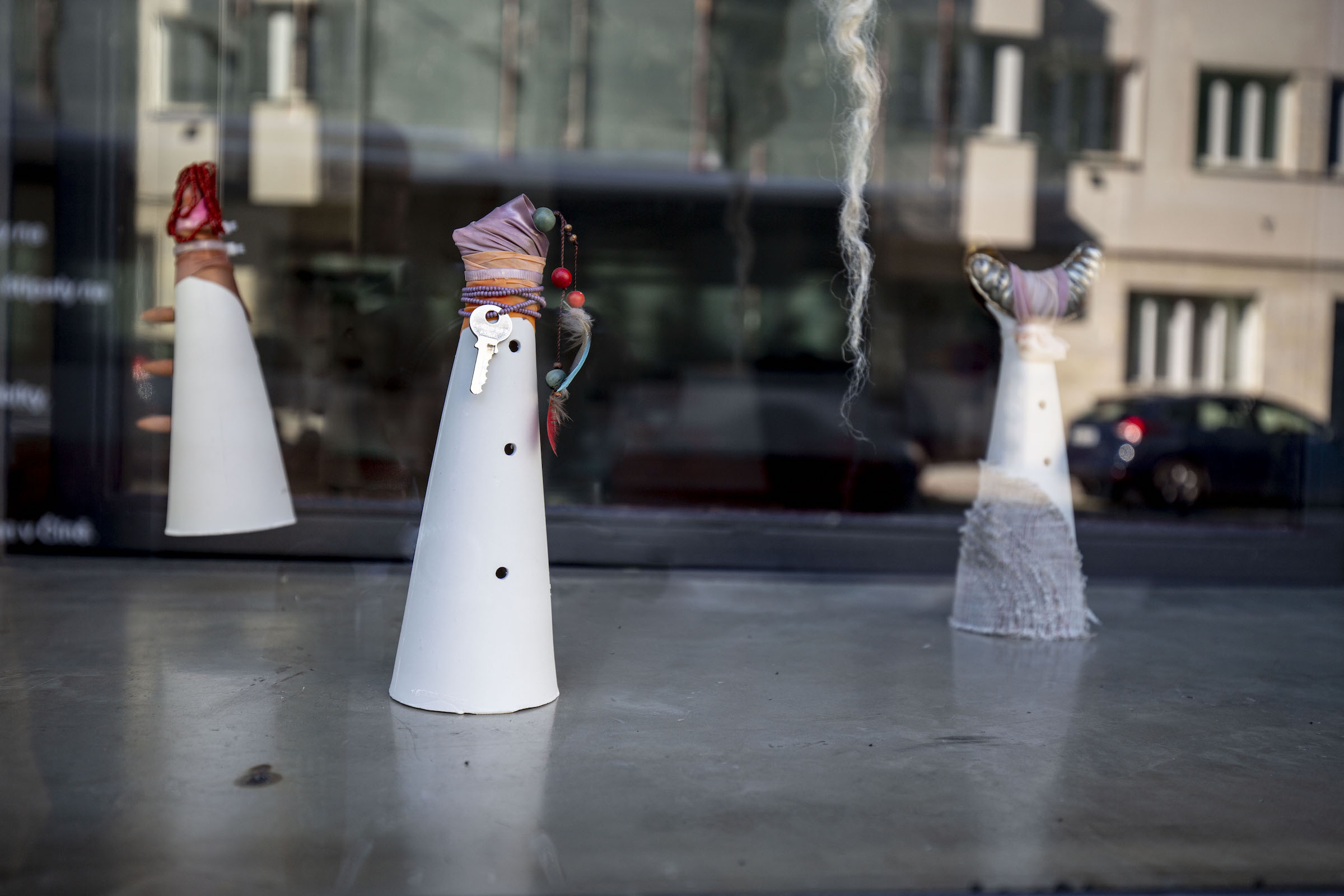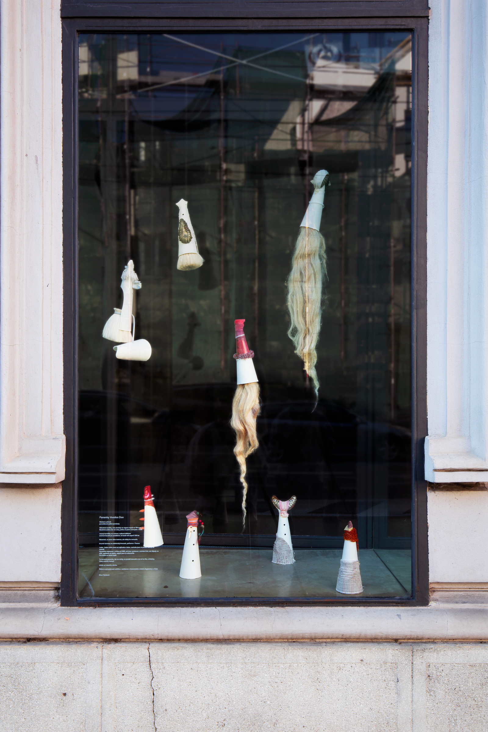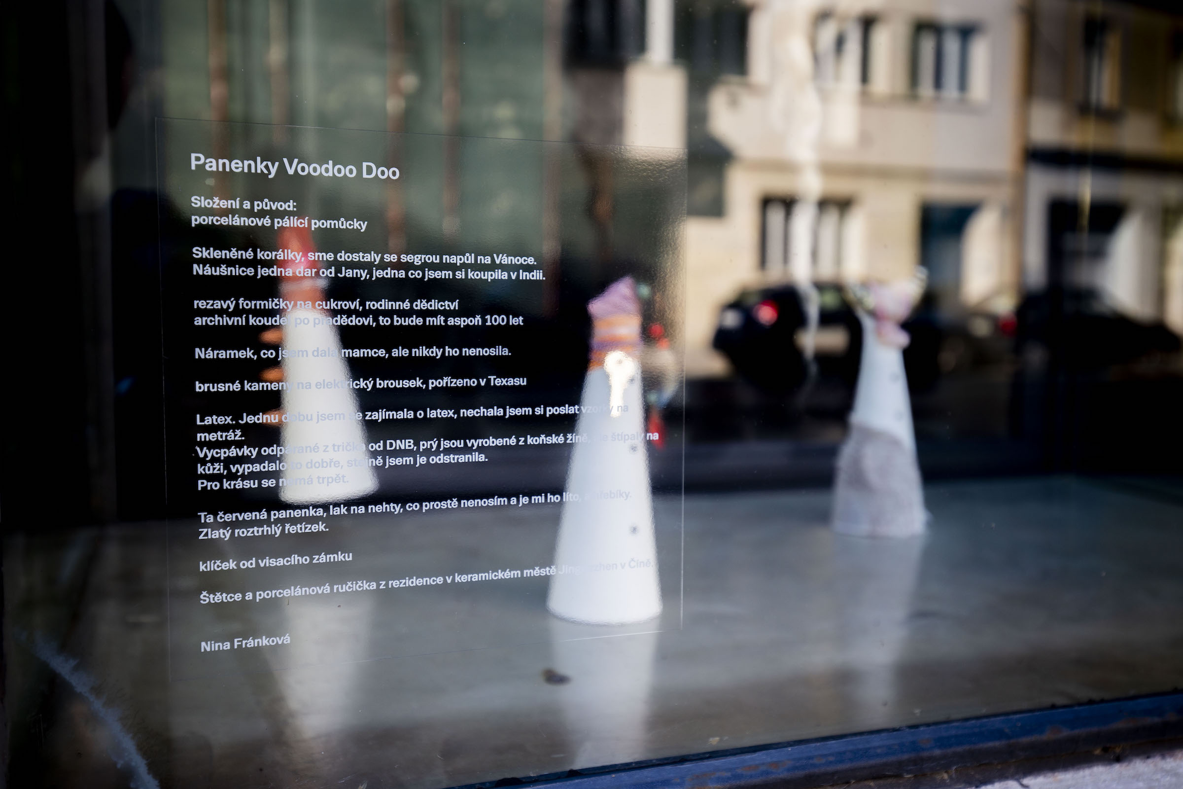 Panenky Voodoo Doo is a site-specific installation created for the storefront window of a hair salon in Brno. The work combines found objects, inherited materials, and personal relics, forming a poetic and fragmented inventory. Written as a rap-like list and displayed directly on the glass, the text itself became part of the installation — an incantation, a memory map, and a quiet spell.