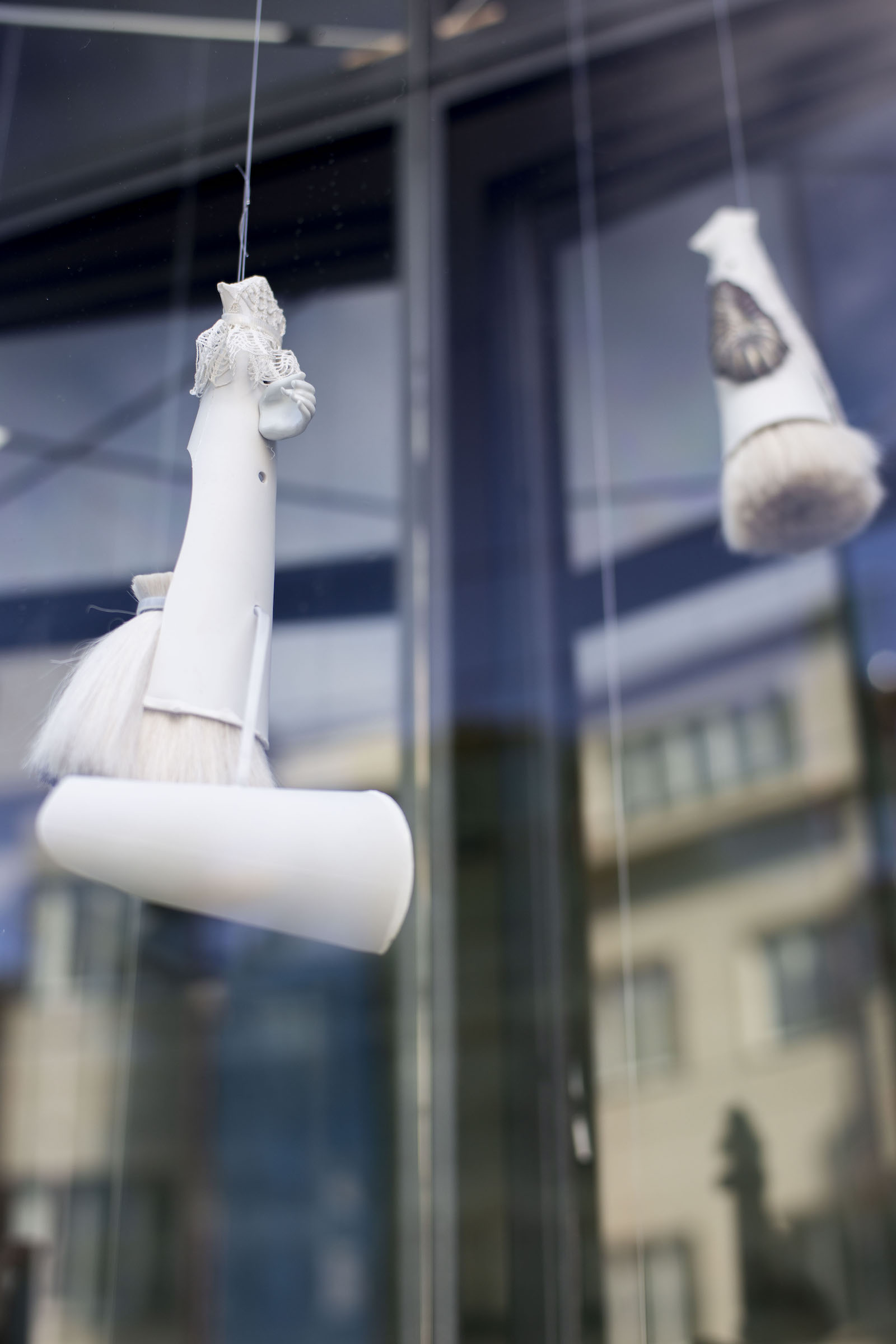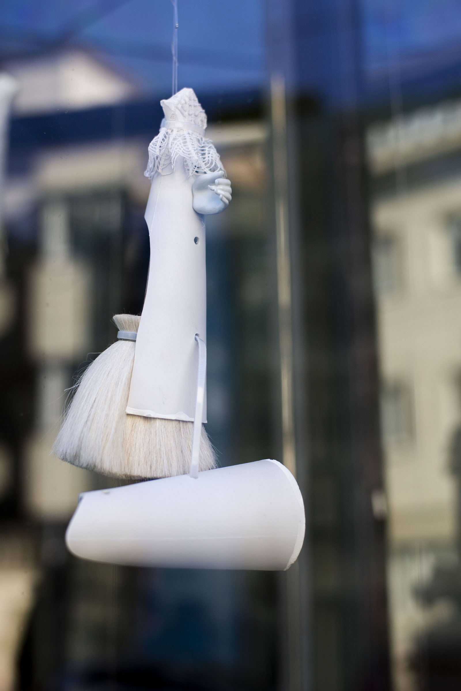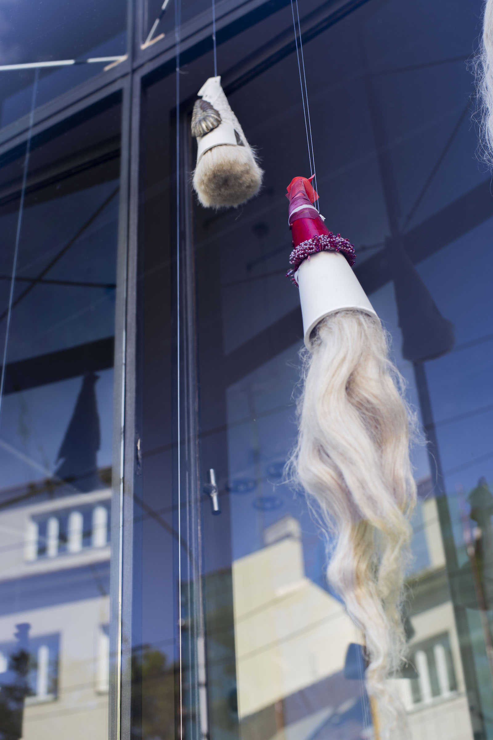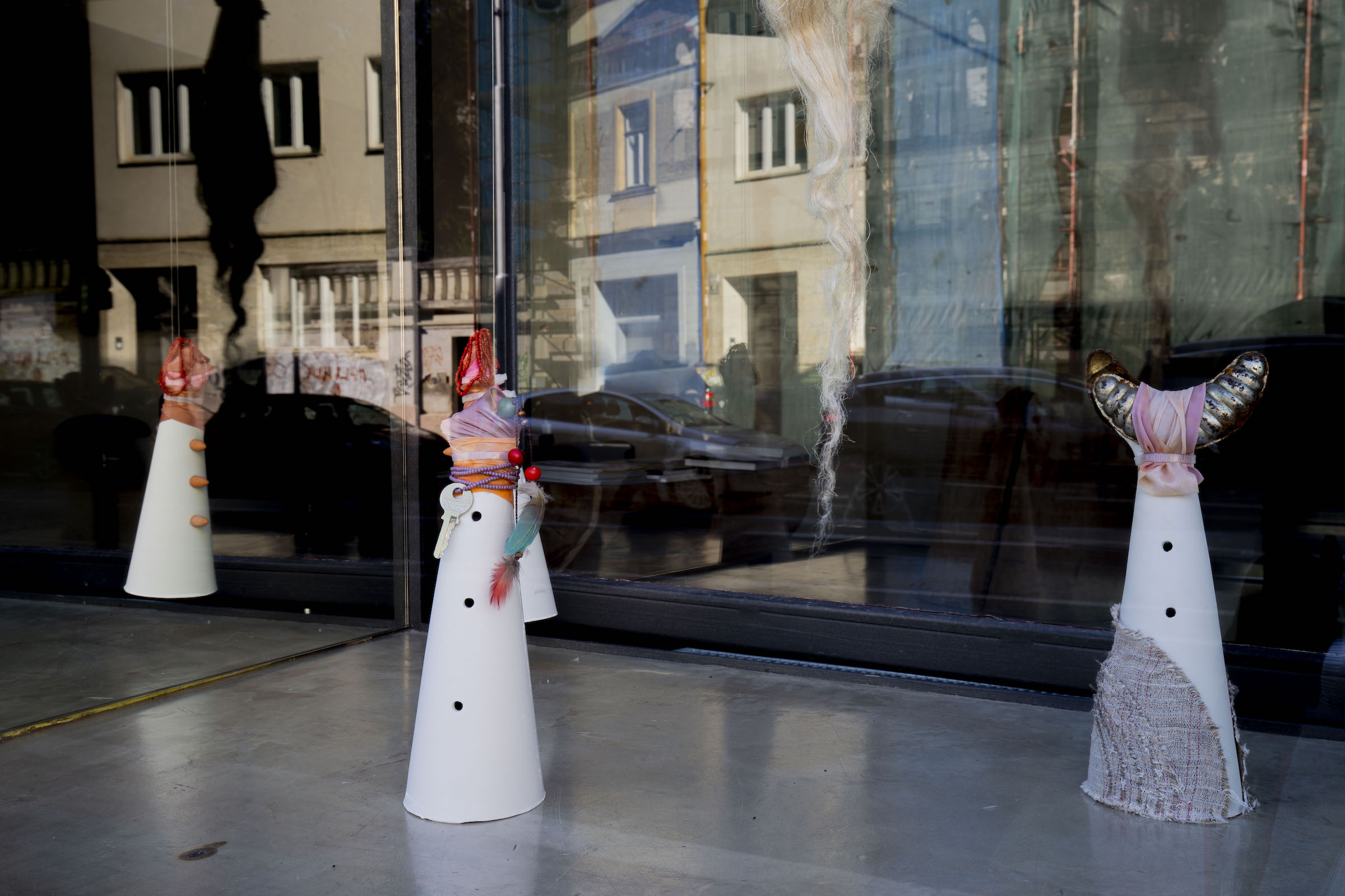 Panenky Voodoo Doo is a site-specific installation created for the storefront window of a hair salon in Brno. The work combines found objects, inherited materials, and personal relics, forming a poetic and fragmented inventory. Written as a rap-like list and displayed directly on the glass, the text itself became part of the installation — an incantation, a memory map, and a quiet spell.